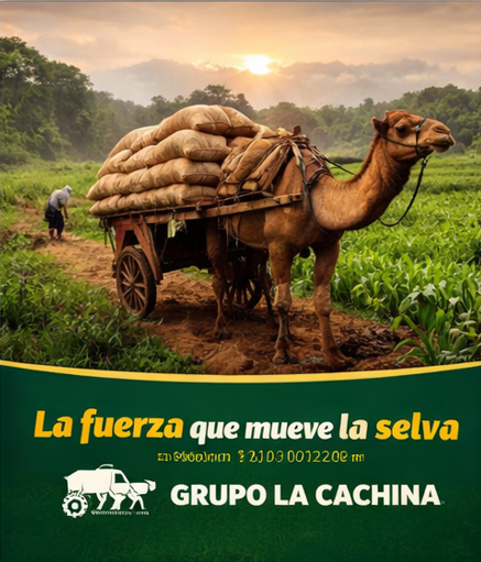 Nuestro logotipo, representado por un camello tirando de una carreta, refleja resistencia, capacidad de carga y movimiento. Este símbolo representa el esfuerzo continuo y la energía que impulsa la actividad comercial y agrícola en la selva